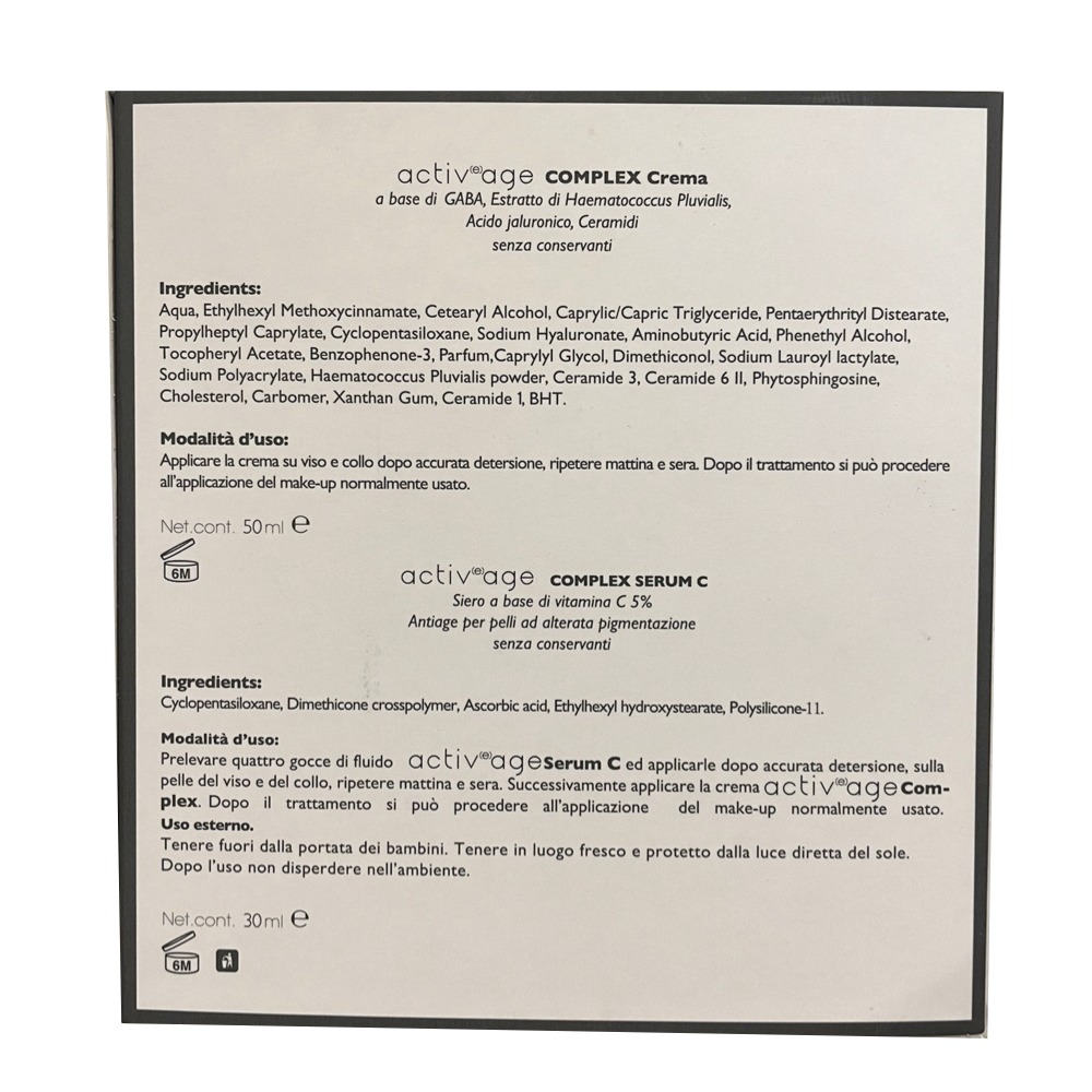 Prelevare quattro gocce di fluido activ ageserum C ed applicarle dopo accurata detersione, sulla pelle del viso e del collo, ripetere mattina e sera. Successivamente applicare la crema activage complex. Dopo il trattamento si può procedere all'applicazione del make-up normalmente usato.
