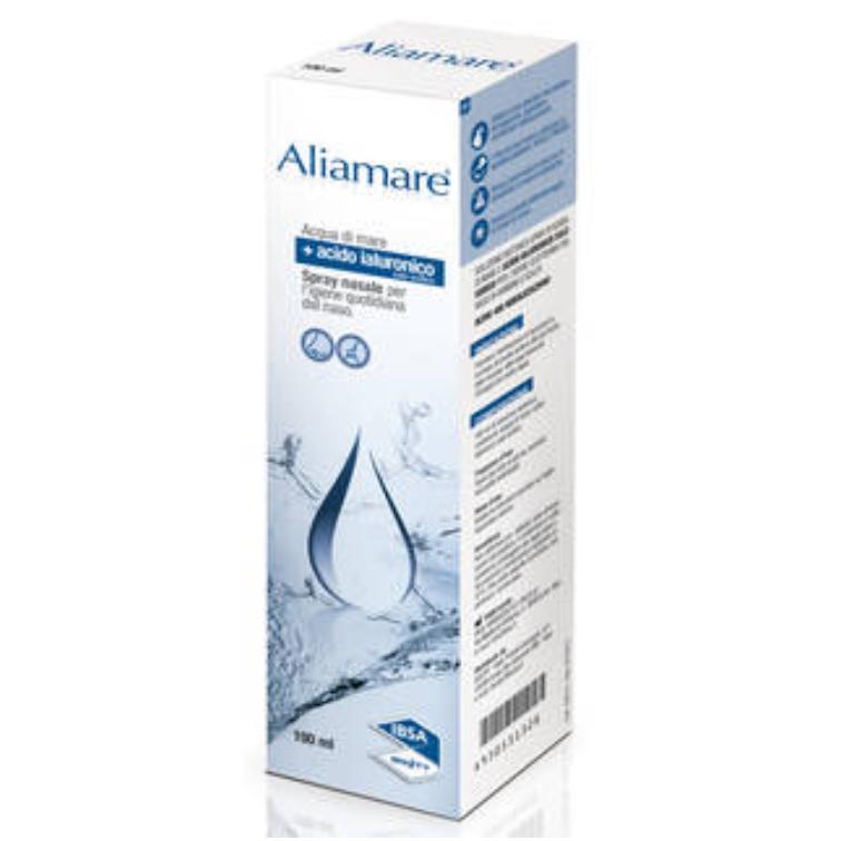 Dispositivo Medico CE, classe IIa. Soluzione isotonica spray di acqua di mare e ialuronato sodico per l'igiene quotidiana di naso negli adulti. Aliamare associa l'azione benefica e fluidificante dell'acqua marina proveniente dall'Arcipelago di Brèhat, luogo naturalistico della Bretagna classificato Natura 2000, all'azione dell'acido ialuronico, che grazie alla sua capacità di legare e trattenere acqua, è in grado di idratare la mucosa e favorire la cicatrizzazione di eventuali microlesioni. La diluizione dell'acqua di mare fino a concentrazione isotonica rende inoltre Aliamare non irritante.Favorisce l'eliminazione di secrezioni in eccesso, dà pronto sollievo alla secchezza delle mucose, utile dopo interventi chirurgici alle cavità nasali.