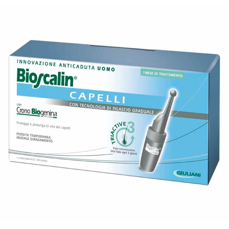 Bioscalin fiale con CronoBiogenina, è un trattamento coadiuvante anticaduta, per contrastare la caduta temporanea e l'iniziale diradamento nell'uomo. La tecnologia di rilascio prolungato Triactive3, permette alla tripla concentrazione di attivi il rilascio graduale in 3 giorni e in profondità. La sua formula grazie alla presenza delle CronoBiogenina risulta utile per proteggere e prolungare la vita dei capelli. Non unge i capelli, non li appesantisce e si asciuga in fretta. Bioscalin è formulato per ridurre al minimo i fenomeni irritativi. Grazie a Triactive3 Bioscalin Fiale con CronoBiogenina: utilizza una Tripla concentrazione di attivi. Penetra rapidamente fino al follicolo del capello senza venire asportato dai lavaggi. Si deposita per essere poi rilasciato gradualmente in 3 giorni, per un'efficacia prolungata. L'utilizzo di questa tecnologia consente l'applicazione del prodotto ogni 3 giorni garantendo la medesima azione di un utilizzo giornaliero del prodotto. CronoBiogenina Favorisce il regolare ciclo di formazione, caduta e ricrescita dei capelli: contribuisce alla corretta funzionalità del bulbo e lo preserva da una senescenza precoce dovuta anche all'azione dei radicali liberi, generati da stress psico-fisico, alimentazione non corretta, fumo, smog (principali cause di una caduta anticipata del capello) e di alcuni enzimi tra cui la Caspase3. Migliora la capacità di assorbimento dei tessuti intorno alla radice aumentando l'apporto di nutrimento ed ossigeno al bulbo del capello. Biotina e Calcio Pantotenato Specifiche vitamine che nutrono e rinforzano i capelli.