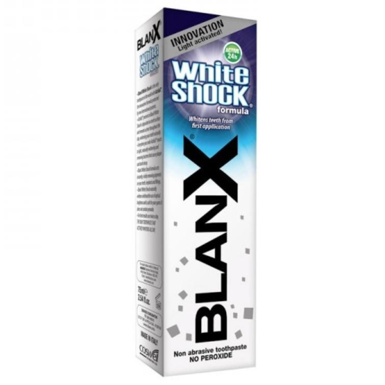 I vantaggi di BlanX White Shock: - rimuove lo sporco e le macchie già esistenti impedendo che se ne creino di nuove, - forma una barriera protettiva sulla superficie dei denti, mantenendoli forti e protetti, - aiuta anche a rimuovere i batteri presenti sullo spazzolino, responsabili di carie ed infezioni del cavo orale, - sbianca anche le superfici ceramiche e polimeriche di protesi dentarie e capsule, rendendo il colore uniforme, - produce un effetto superidrofilico, idratando le gengive, - ha un'azione sbiancante continua nell'arco della giornata anche dopo il lavaggio con lo spazzolino.