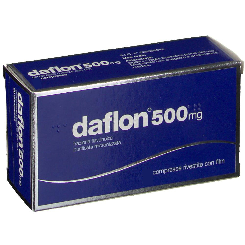 FOGLIO ILLUSTRATIVO DAFLON 500 mg compresse rivestite con film Frazione flavonoica purificata micronizzata Categoria farmacoterapeutica Vasoprotettori Indicazioni terapeutiche Sintomi attribuibili a insufficienza venosa; stati di fragilità capillare. Controindicazioni Ipersensibilità al principio attivo o ad uno qualsiasi degli eccipienti. Precauzioni per l’uso Nessuna. Interazioni Non sono stati effettuati studi di interazione. Informare il medico o il farmacista se si è recentemente assunto qualsiasi altro medicinale, anche quelli senza prescrizione medica. Avvertenze speciali Gravidanza Chiedere consiglio al medico o al farmacista prima di prendere qualsiasi medicinale. La sicurezza del farmaco in gravidanza non è stata determinata, pertanto è opportuno non somministrare il prodotto durante la gravidanza. Allattamento In assenza di dati sull’escrezione nel latte, il trattamento deve essere evitato durante l’allattamento, Effetti sulla capacità di guidare veicoli e di utilizzare macchinari Non sono stati condotti studi per valutare l’effetto della frazione flavonoica sulla capacità di guidare veicoli o di usare macchinari. Dose, modo e tempo di somministrazione 2 compresse rivestite con film al giorno (1 a mezzogiorno e 1 alla sera) al momento dei pasti, anche nell’insufficienza venosa del plesso emorroidario. Sovradosaggio Non sono segnalati casi di sovradosaggio. In caso di assunzione accidentale di una dosa eccessiva di DAFLON avvertire immediatamente il medico o rivolgersi al più vicino ospedale. SE SI HA QUALSIASI DUBBIO SULL’USO DI QUESTO MEDICINALE, RIVOLGERSI AL MEDICO O AL FARMACISTA. Effetti indesiderati Come tutti i medicinali, DAFLON può causare effetti indesiderati sebbene non tutte le persone li manifestino. La frequenza delle possibili reazioni avverse elencate di seguito è descritta usando la seguente convenzione: - molto comune (si verificano in più di 1 paziente su 10) - comune (si verificano da 1 a 10 pazienti su 100) - non comune (si verificano da 1 a 10 pazienti su 1.000)- raro (si verificano da 1 a 10 pazienti su 10.000) - molto raro (si verificano in meno di 1 paziente su 10.000) - non nota (la frequenza non può essere definita sulla base dei dati disponibili). Gli effetti indesiderati includono: Patologie del sistema nervoso Raro: vertigini, cefalea, malessere Patologie gastrointestinali Comune: diarrea, dispepsia, nausea, vomito. Non comune: colite Non nota: dolore addominale Patologie della cute e del tessuto sottocutaneo Raro: rash, prurito, orticaria. Non nota: edema al volto, alle labbra, alla palpebra (gonfiore); edema di Quincke (rapido ingrossamento del volto, delle labbra, della bocca, della lingua o della gola che può portare a difficoltà nel respirare). Patologie del sistema emolinfopoietico Non nota: trombocitopenia. Il rispetto delle istruzioni contenute nel foglio illustrativo riduce il rischio di effetti indesiderati. Segnalazione degli effetti indesiderati Se manifesta un qualsiasi effetto indesiderato, compresi quelli non elencati in questo foglio, si rivolga al medico, al farmacista o all’infermiere. Lei può inoltre segnalare gli effetti indesiderati direttamente tramite il sistema nazionale di segnalazione all’indirizzo www.agenziafarmaco.gov.it/it/responsabili. segnalando gli effetti indesiderati lei può contribuire a fornire maggiori informazioni sulla sicurezza di questo medicinale. Scadenza e conservazione Scadenza: vedere la data di scadenza indicata sulla confezione. Attenzione: non utilizzare il medicinale dopo la data di scadenza indicata sulla confezione. La data di scadenza indicata si riferisce al prodotto in confezionamento integro, correttamente conservato. I medicinali non devono essere gettati nell'acqua di scarico e nei rifiuti domestici. Chiedere al farmacista come eliminare i medicinali che non utilizza più. Questo aiuterà a proteggere l'ambiente. TENERE QUESTO MEDICINALE FUORI DALLA VISTA E DALLA PORTATA DEI BAMBINI. Composizione Ogni compressa contiene: principio attivo: Frazione flavonoica purificata micronizzata 500 mg - costituita da diosmina 450 mg, flavonoidi espressi in esperidina 50 mg - eccipienti: carbossimetilamido sodico; cellulosa microcristallina; gelatina; glicerina; ipromellosa; sodio laurilsolfato; ossido di ferro giallo E 172; ossido di ferro rosso E 172; titanio diossido; macrogol 6000; magnesio stearato; talco. Forma farmaceutica e contenuto 15 compresse rivestite con film 30 compresse rivestite con film 60 compresse rivestite con film Via orale. E’ possibile che non tutte le confezioni siano commercializzate. Titolare dell'autorizzazione all'immissione in commercio Les Laboratoires Servier 50, rue Carnot 92284 Suresnes cedex - FranciaRappresentante per l'Italia Servier Italia S.p.A. Via Luca Passi, 85 00166 Roma Produttore Les Laboratoires Servier Industrie 905 route de Saran 45520 Gidy - Francia