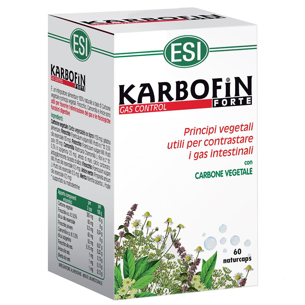 Karbofin forte Esi è un integratore efficace al 100% contro i disturbi causati dal gonfiore addominale e da una digestione non corretta. L'effetto di Karbofin forte Esi riduce il senso di gonfiore all'intestino, favorisce la digestione e contrasta flatulenza e meteorismo. Karbofin forte Esi contiene infatti Carbone vegetale, noto per la sua efficace azione contro i gas intestinali e gonfiori addominali, Finocchio, stimolante della motilità gastrointestinale, Camomilla ed Olii essenziali quali Menta, Anice e Finocchio, noti per la loro azione spasmolitica. Inoltre l'integratore Karbofin forte Esi non contiene Glutine, dervati del latte, lattosio, zuccheri aggiunti, conservanti aggiunti, coloranti artificiali, aromi artificiali, ogm.