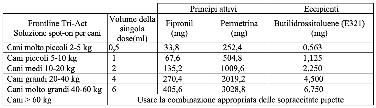 Per applicazione topica cutanea (uso spot-on). La tabella seguente indica la pipetta da utilizzare in base al peso del cane:
