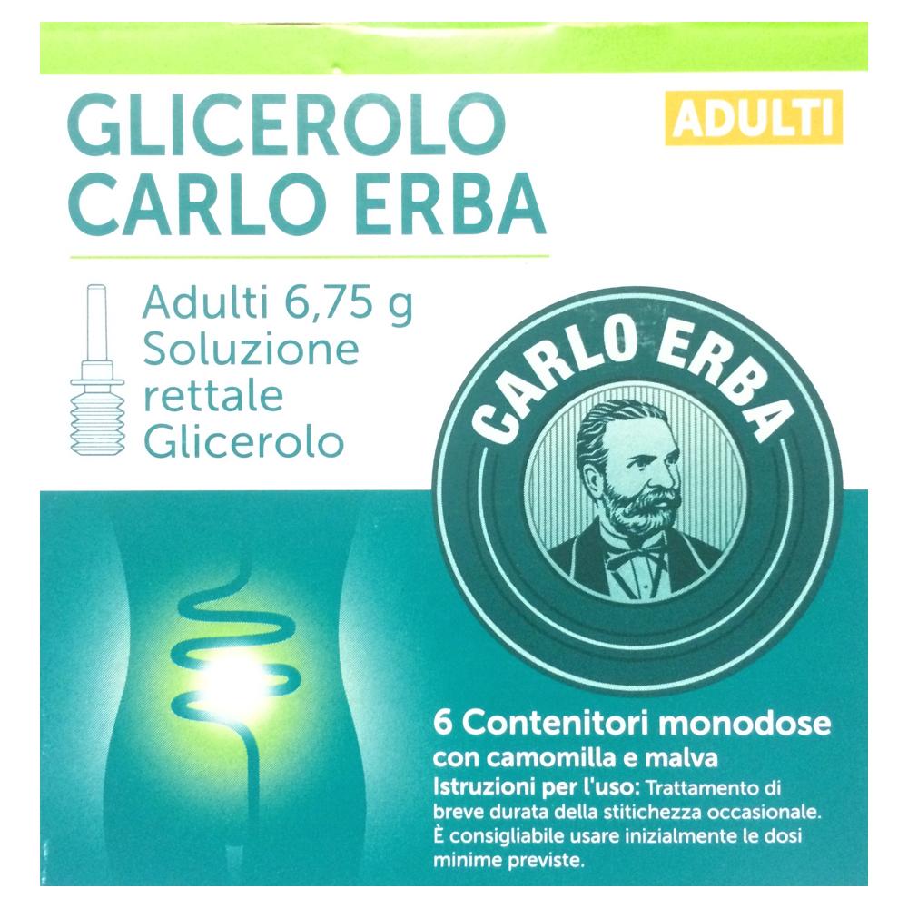 Foglio illustrativo: informazioni per il paziente GLICEROLO CARLO ERBA Bambini 2,25 g soluzione rettale GLICEROLO CARLO ERBA Adulti 6,75 g soluzione rettale Glicerolo Legga attentamente questo foglio prima di usare questo medicinale perché contiene importanti informazioni per lei. Usi questo medicinale sempre come esattamente descritto in questo foglio o come il medico o il farmacista le ha detto di fare. - Conservi questo foglio. Potrebbe aver bisogno di leggerlo di nuovo. - Se desidera maggiori informazioni o consigli, si rivolga al farmacista. - Se si manifesta uno qualsiasi degli effetti indesiderati, tra cui effetti non elencati in questo foglio, si rivolga al medico o al farmacista. Vedere paragrafo 4. - Si rivolga al medico se non nota miglioramenti o se nota un peggioramento dei sintomi dopo un breve periodo di trattamento. Contenuto di questo foglio: 1. Che cos’è GLICEROLO CARLO ERBA e a cosa serve 2. Cosa deve sapere prima di usare GLICEROLO CARLO ERBA 3. Come usare GLICEROLO CARLO ERBA 4. Possibili effetti indesiderati 5. Come conservare GLICEROLO CARLO ERBA 6. Contenuto della confezione e altre informazioni 1. Che cos’è GLICEROLO CARLO ERBA e a cosa serve Il glicerolo, principio attivo di questo medicinale, serve per facilitare l’eliminazione delle feci. L'effetto lassativo si ottiene grazie alla capacità che ha il glicerolo di ammorbidire le feci e di provocare una leggera azione irritante locale che stimola i movimenti intestinali. Questo medicinale è indicato per il sollievo sintomatico della stitichezza occasionale e transitoria. Si rivolga al medico se non si sente meglio o se si sente peggio dopo un breve periodo di trattamento. 2. Cosa deve sapere prima di usare GLICEROLO CARLO ERBA Non usi GLICEROLO CARLO ERBA se: è allergico al principio attivo o ad uno qualsiasi degli altri componenti di questo medicinale (elencati al paragrafo 6); ha nausea o vomito,un’ostruzione o un restringimento (stenosi) dell’intestino,o qualsiasi situazione di dolore all’addome della quale non conosce la causa; ha dolore e/o sanguinamento del retto (ad esempio in caso di emorroidi); è in uno stato grave di disidratazione che si manifesta con bocca secca e appiccicosa, sete, scarsità di urina, assenza o scarsità di lacrime e pelle secca. Avvertenze e precauzioniI lassativi devono essere usati il meno frequentemente possibile e per non più di 7 giorni; l’uso per periodi di tempo maggiori richiede la prescrizione del medico. Durante il trattamento beva almeno 6-8 bicchieri di acqua, o altri liquidi, in modo da favorire l’ammorbidimento delle feci. L’abuso di lassativi può causare dipendenza (con possibile necessità di aumentare progressivamente il dosaggio), stitichezza cronica e perdita delle normali funzioni intestinali (atonia intestinale). Inoltre l’abuso potrebbe causare diarrea persistente con conseguente perdita di acqua (disidratazione), sali minerali, specialmente potassio (ipopotassemia) ed altri fattori nutritivi essenziali. La perdita di sali minerali causa alterazioni degli ioni presenti nel sangue (elettrolitici) caratterizzati dai seguenti sintomi: sete, vomito, indebolimento, edema, dolori alle ossa (osteomalacia) e ipoalbuminemia. Effetti indesiderati più gravi sono le disfunzioni del cuore e dei muscoli specialmente in caso di trattamento contemporaneo con alcuni farmaci per il cuore (glicosidi cardiaci), con farmaci che aumentano la diuresi (diuretici) o corticosteroidi. Si rivolga al medico prima di usare GLICEROLO CARLO ERBA: se è anziano o non è in buone condizioni di salute; se la necessità di un lassativo deriva da un improvviso cambiamento delle precedenti abitudini intestinali (frequenza e caratteristiche delle evacuazioni) che duri da più di due settimane; nei bambini con meno di 12 anni. Se l’uso del lassativo non riesce a produrre effetti dopo un breve periodo di trattamento, si rivolga al medico. Altri medicinali e GLICEROLO CARLO ERBA Informi il medico o il farmacista se sta assumendo, ha recentemente assunto o potrebbe assumere qualsiasi altro medicinale. Gravidanza e allattamento Se è in corso una gravidanza, se sospetta o sta pianificando una gravidanza, o se sta allattando con latte materno chieda consiglio al medico o al farmacista prima di usare questo medicinale. Guida di veicoli e utilizzo di macchinari Questo medicinale non altera la capacità di guidare veicoli o di usare macchinari. 3. Come usare GLICEROLO CARLO ERBA Usi questo medicinale seguendo sempre esattamente quanto riportato in questo foglio o le istruzioni del medico o del farmacista. Se ha dubbi consulti il medico o il farmacista. La dose corretta è quella minima sufficiente a produrre una facile evacuazionedi feci molli. È consigliabile usare inizialmente le dosi minime previste. I lassativi devono essere usati il meno frequentemente possibile e per non più di 7 giorni. Una dieta ricca di liquidi favorisce l’effetto del medicinale. Uso negli adulti e negli adolescenti(12 - 18 anni) La dose raccomandata è di 1 contenitore monodose adulti, 1 o 2 volte al giorno. Uso nei bambini (6 - 11 anni) La dose raccomandata è di 1-2 contenitori monodose bambini, 1 o 2 volte al giorno. Uso nei bambini (2 - 6 anni) La dose raccomandata è di 1contenitore monodose bambini, 1 o 2 volte al giorno. Utilizzare GLICEROLO CARLO ERBA solo dopo aver consultato il medico. Non usare nei bambini al di sotto dei 2 anni.Modo di somministrazione 1. Togliere il copricannula di sicurezza del contenitore monodose, appoggiando indice e pollice sulla ghiera rotonda posta sopra il soffietto e, con l'altra mano, piegare il copricannula fino a provocarne il distacco del corpo del contenitore. Durante l'operazione, non afferrare mai il soffietto, altrimenti si verificherebbe la fuoriuscita del medicinale prima dell'utilizzo; 2. Lubrificare la cannula con una goccia della soluzione stessa, prima di introdurla nel retto e premere il soffietto; 3. Estrarre la cannula tenendo premuto il sof