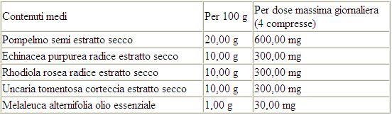 Pompelmo (citrus grandis, maltodestrina) semi estratto secco, agente di carica: cellulosa microcristallina, maltodestrina, echinacea (echinacea purpurea, maltodestrina), radice estratto secco, rhodiola (rhodiola rosea, maltodestrina), radice estratto secco, uncaria (uncaria tomentosa, maltodestrina) corteccia estratto secco, sorbitolo, antiagglomeranti: biossido di silicio e stearato di magnesio, magnesio ossido, melaleuca (melaleuca alternifolia, maltodestrina) olio essenziale.