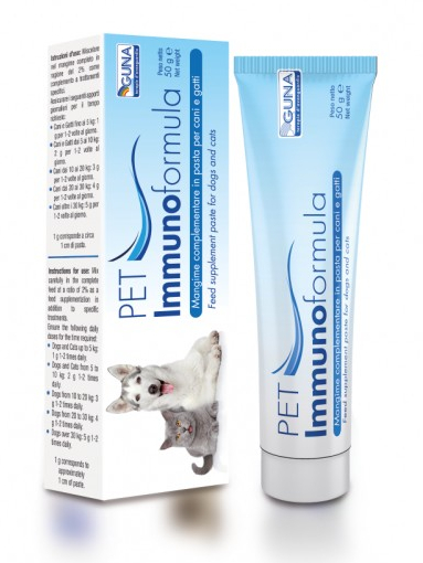 Miscelare nel mangime completo in ragione del 2% come complemento a diete specifiche. Pet Immunoformula può essere somministrato direttamente nella bocca dell'animale, o nella ciotola mescolato nell'alimento. Se spalmato sulla zampina, il gatto provvederà ad assumerlo spontaneamente durante lo svolgimento delle quotidiane attività di pulizia del proprio mantello.