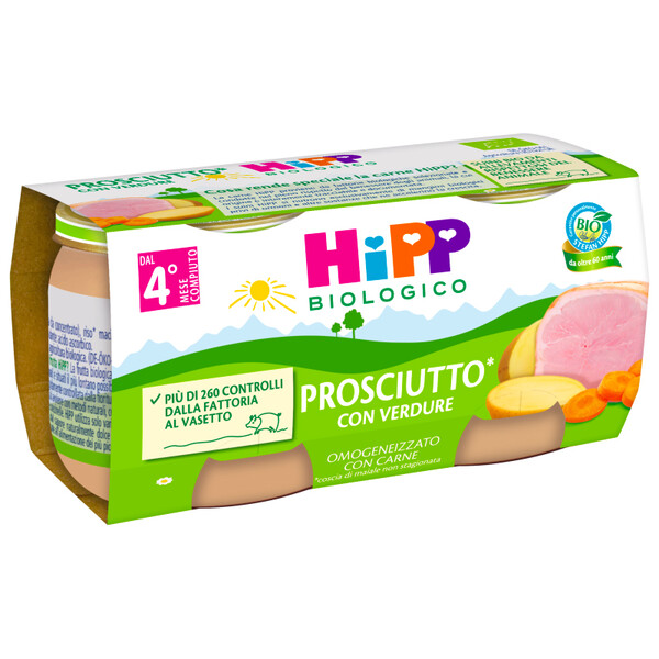 | Omogeneizzato biologico con carne di prosciutto, verdure e amido di riso. Prodotto indicato dal 4° mese compiuto, secondo il parere del pediatra. Ideale per completare pappe, brodi e passati. Ingredienti: Acqua di cottura, verdure* 30% (patate*, carote*), prosciutto* 20% (coscia di maiale* non stagionata, sale iodato), amido di riso* 5%, olio di semi di girasole*. *da agricoltura biologica.