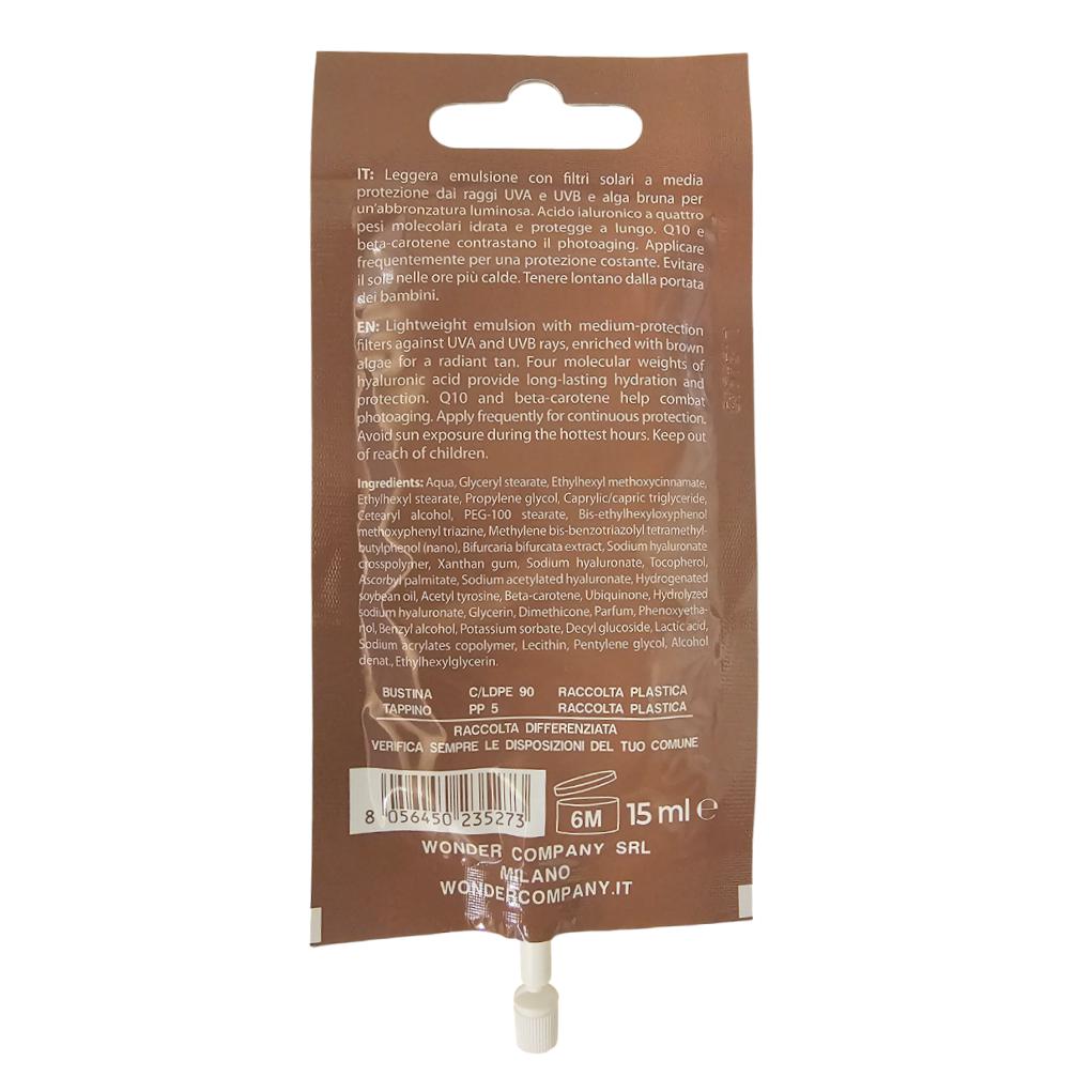 Leggera emulsione con filtri solari a protezione molto alta dai raggi UVA e UVB e alga bruna per un'abbronzatura luminosa. Acido ialuronico a quattro pesi molecolari idrata e protegge a lungo. Q10 e beta-carotene contrastano il photoaging. Applicare frequentemente per una protezione costante. Evitare il sole nelle ore più calde. Tenere lontano dalla portata dei bambini.