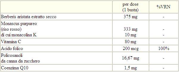 Ingredienti: Berberis aristata D.C. estratto secco, monascus purpureo, vitamina C, policosanoli, coenzima Q10, acido folico.