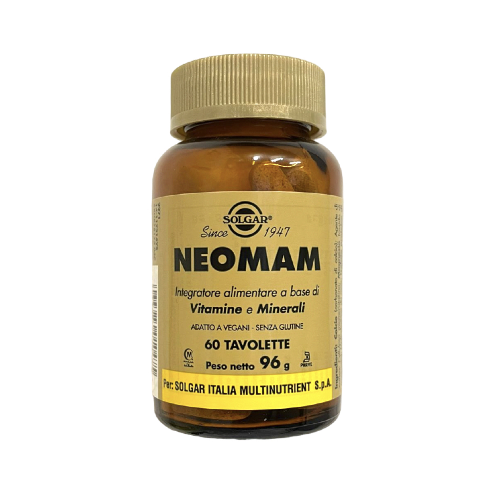 Integratore alimentare contenente ben 24 nutrienti tra vitamine e minerali opportunamente dosati secondo i VNR* specifici per la donna in gravidanza. NEOMAM può essere utilizzato anche durante l'allattamento a completamento di un'alimentazione che dev'essere comunque il più variata possibile. NEOMAM contiene tra gli altri nutrienti acido folico e iodio, nutrienti raccomandati dall'Organizzazione Mondiale della Sanità. In particolare, l'assunzione integrativa di acido folico aumenta lo stato del folato materno. Un basso stato del folato materno è un fattore di rischio per lo sviluppo di difetti del tubo neurale del feto. NEOMAM fornisce inoltre ferro bisglicinato, un minerale scelto in una forma biochimica brevettata, facilmente assimilabile e digeribile. La formula è arricchita con calcio, beta-carotene ed altri importanti elementi nutritivi come cromo, selenio spesso mancanti nelle formule prenatali.