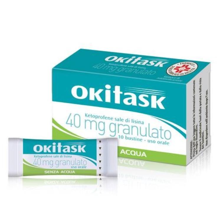 Foglio illustrativo: informazioni per l’utilizzatore Okitask 40 mg granulato ketoprofene sale di lisina Legga attentamente questo foglio prima di prendere questo medicinale perché contiene importanti informazioni per lei. Prenda questo medicinale sempre come esattamente descritto in questo foglio o come il medico o il farmacista le ha detto di fare. - Conservi questo foglio. Potrebbe aver bisogno di leggerlo di nuovo. - Se desidera maggiori informazioni o consigli, si rivolga al farmacista. - Se si manifesta uno qualsiasi degli effetti indesiderati, tra cui effetti non elencati in questo foglio, si rivolga al medico o al farmacista. Vedere paragrafo 4. - Si rivolga al medico se non nota miglioramenti o se nota un peggioramento dei sintomi dopo un breve periodo di trattamento. Contenuto di questo foglio: 1. Che cos’è Okitask e a cosa serve 2. Cosa deve sapere prima di prendere Okitask 3. Come prendere Okitask 4. Possibili effetti indesiderati 5. Come conservare Okitask 6. Contenuto della confezione e altre informazioni 1. Che cos’è Okitask e a cosa serve Il nome del suo medicinale è Okitask 40 mg granulato (chiamato Okitask in questo foglio illustrativo). Okitask contiene come principio attivo ketoprofene sale di lisina che appartiene ad un gruppo di medicinali chiamati “Farmaci Antinfiammatori Non Steroidei” (FANS). Il ketoprofene agisce bloccando le sostanze chimiche che normalmente causano infiammazione nel nostro corpo. Questo medicinale si usa per dolori di diversa origine e natura, ed in particolare: mal di testa, mal di denti, nevralgie (dolori dei nervi), dolori mestruali, dolori muscolari e osteoarticolari (delle ossa e delle articolazioni). Si rivolga al medico se non si sente meglio o se si sente peggio dopo un breve periodo di trattamento. 2. Cosa deve sapere prima di prendere Okitask Non prenda Okitask - se è allergico al ketoprofene o a sostanze con analogo meccanismo d’azione (per esempio acido acetilsalicilico o altri FANS) o ad uno qualsiasi degli altri componenti di questo medicinale (elencati al paragrafo 6 “Contenuto della confezione e altre informazioni”); - se ha una storia di reazioni di ipersensibilità (allergia) come broncospasmo (restringimento dei bronchi, che causa difficoltà nella respirazione), attacchi d'asma, rinite acuta, orticaria, eruzioni cutanee. Reazioni anafilattiche gravi, raramente fatali, sono state osservate nei pazienti con storia di ipersensibilità (si veda il paragrafo 4 “Possibili effetti indesiderati”). - se ha ulcera gastrica o duodenale, con ulcera peptica attiva/emorragia o storia di emorragia/ulcera peptica ricorrente (due o più episodi distinti, comprovati di sanguinamento o ulcerazione); - se ha gastrite e disturbi digestivi cronici (dispepsia);- se ha una storia di emorragia gastrointestinale, ulcerazione o perforazione conseguente a precedente terapia con FANS; - se ha emorragie in atto o diatesi emorragica (predisposizione alle emorragie); - se soffre di leucopenia (riduzione del numero di globuli bianchi) o piastrinopenia (riduzione del numero delle piastrine); - se è in terapia con anticoagulanti (medicinali che fluidificano il sangue), altri FANS o acido acetilsalicilico (si veda il sottoparagrafo “Altri medicinali e Okitask”); - se ha una severa insufficienza renale (ridotta funzionalità dei reni), epatica (ridotta funzionalità del fegato) o cardiaca (l’incapacità del cuore di pompare l’adeguata quantità del sangue necessaria alle esigenze dell’organismo); - se sta già assumendo altri farmaci antinfiammatori e a base di acido acetilsalicilico; - se è nel terzo trimestre di gravidanza (gli ultimi tre mesi di gravidanza); - se è in stato di gravidanza o se sta allattando (si veda il sottoparagrafo “Gravidanza, allattamento e fertilità”); - se è sottoposto ad importanti interventi chirurgici; Non dia questo medicinale ai bambini e agli adolescenti al di sotto dei 15 anni (si veda il sottoparagrafo “Bambini e adolescenti”). Avvertenze e precauzioni Si rivolga al medico o al farmacista prima di prendere Okitask. Durante il trattamento con tutti i FANS, come Okitask, in qualsiasi momento, con o senza sintomi di preavviso o precedente storia di gravi eventi gastrointestinali, sono state riportate emorragia gastrointestinale, ulcerazione e perforazione, che possono essere fatali. I pazienti anziani sono maggiormente esposti al rischio di sviluppare reazioni avverse ai FANS, specialmente emorragie e perforazioni gastrointestinali, che possono essere fatali (si veda il paragrafo 3 “Come prendere Okitask”). Il ketoprofene può essere associato a un elevato rischio di grave tossicità gastrointestinale, rispetto ad altri FANS, soprattutto ad alte dosi. Gravi reazioni cutanee (della pelle) alcune delle quali fatali, come dermatite esfoliativa, sindrome di Stevens-Johnson e necrolisi epidermica tossica, sono state riportate molto raramente in associazione con l’uso dei FANS (si veda il paragrafo 4 “Possibili effetti indesiderati”). La reazione si verifica nella maggior parte dei casi nelle fasi iniziali del trattamento. Interrompa l’uso di Okitask in caso di comparsa di rash cutaneo, lesioni delle mucose o qualsiasi altro segno di ipersensibilità. I medicinali come Okitask possono essere associati ad un modesto aumento del rischio di attacco cardiaco (infarto del miocardio) o ictus (accidente cerebrovascolare). Qualsiasi rischio è più probabile con alte dosi e trattamenti prolungati. Non superi la dose o la durata del trattamento raccomandata. L’uso di alcuni FANS (specialmente ad alti dosaggi e per trattamenti di lunga durata) può essere associato ad un aumento del rischio di eventi trombotici arteriosi (per esempio infarto del miocardio o ictus), tale rischio non può essere escluso per ketoprofene sale di lisina. Come gli altri FANS, in presenza di una malattia infettiva, le proprietà del ketoprofene di ridurre l’infiammazione, il dolore e la febbre possono masch