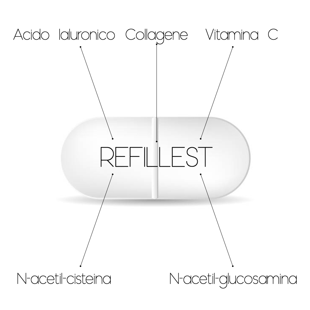 Refillest ha una specifica formulazione, studiata per garantire un ottimale assorbimento di acido ialuronico (basso peso molecolare) e collagene, sostanze destinate a diminuire drasticamente con l'età.