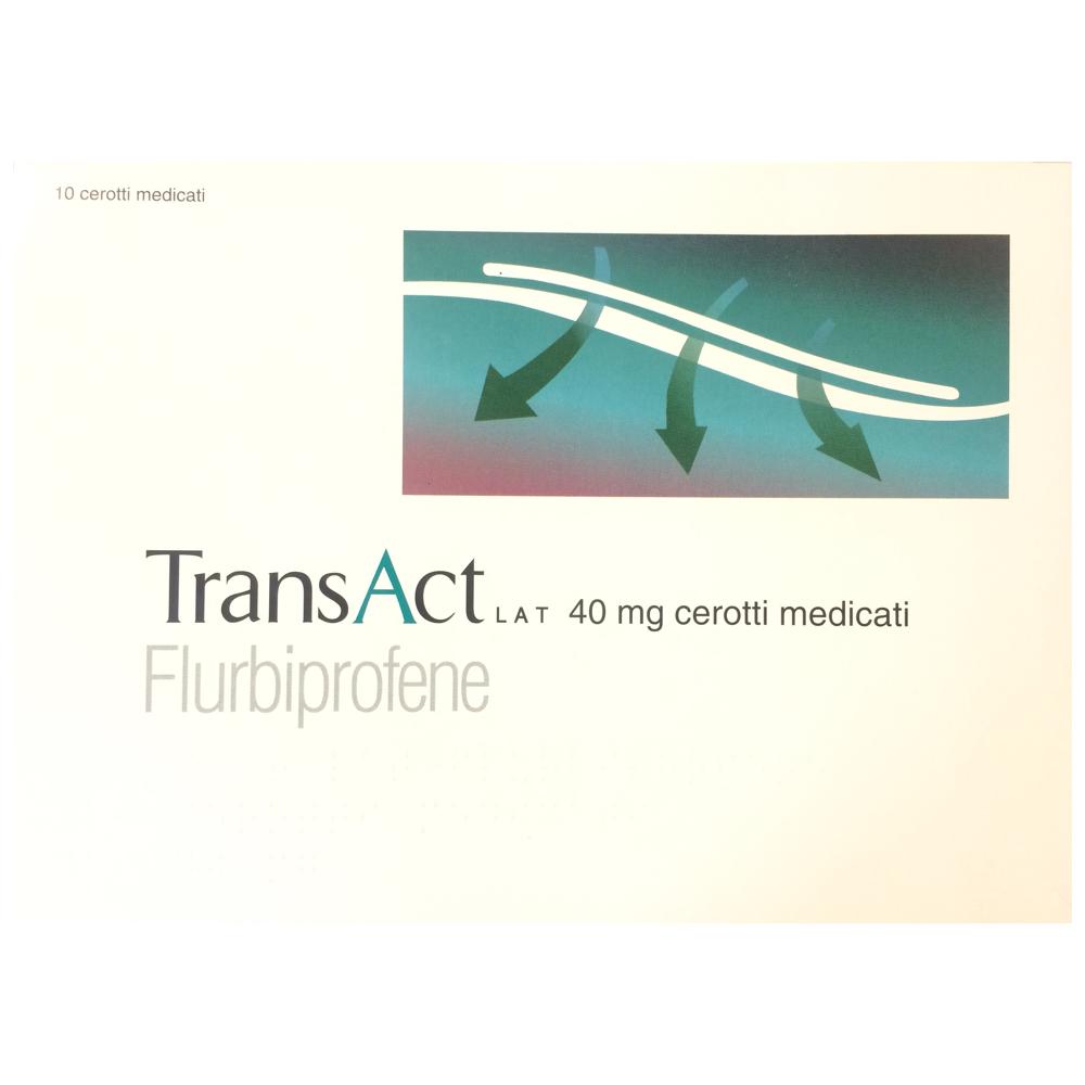 Foglio illustrativo: informazioni per il paziente TRANSACT Lat 40 mg cerotti medicati Flurbiprofene Legga attentamente questo foglio prima di usare questo medicinale perché contiene importanti informazioni per lei. Usi questo medicinale sempre come esattamente descritto in questo foglio o come il medico o farmacista le ha detto di fare. - Conservi questo foglio. Potrebbe aver bisogno di leggerlo di nuovo. - Se desidera maggiori informazioni o consigli, si rivolga al farmacista. - Se si manifesta uno qualsiasi degli effetti indesiderati, tra cui effetti non elencati in questo foglio, si rivolga al medico o al farmacista. Vedere paragrafo 4. - Si rivolga al medico se non nota miglioramenti o se nota un peggioramento dei sintomi dopo un breve periodo di trattamento. Contenuto di questo foglio: 1. Che cos’è TRANSACT Lat e a cosa serve 2. Cosa deve sapere prima di usare TRANSACT Lat 3. Come usare TRANSACT Lat 4. Possibili effetti indesiderati 5. Come conservare TRANSACT Lat 6. Contenuto della confezione e altre informazioni 1. Che cos’è TRANSACT Lat e a cosa serve TRANSACT Lat contiene il principio attivo flurbiprofene ed appartiene alla categoria dei medicinali antinfiammatori non steroidei per uso topico (uso locale). TRANSACT Lat è indicato per il trattamento sintomatico locale degli stati dolorosi a carico dell'apparato muscolo-scheletrico. Si rivolga al medico se non si sente meglio o se si sente peggio dopo un breve periodo di trattamento (pochi giorni). 2. Cosa deve sapere prima di usare TRANSACT Lat Non usi TRANSACT Lat - Se è allergico al flurbiprofene, all’acido acetilsalicilico, ad altri FANS (farmaci antinfiammatori non steroidei) o ad uno qualsiasi degli altri componenti di questo medicinale (elencati al paragrafo 6). - Se soffre o ha sofferto di emorragia gastrointestinale o perforazione correlata a precedenti trattamenti con FANS. - Se soffre o ha sofferto di Colite ulcerosa o di malattia di Crohn (infiammazioni croniche dell’intestino), ulcera peptica ricorrente (lesioni o ulcere dolorose dello stomaco e della prima parte dell’intestino) o emorragia gastrointestinale (definita come due o più episodi distinti di dimostrata ulcerazione o sanguinamento). - Se ha una grave insufficienza cardiaca (patologia in cui il cuore non è in grado di pompare sufficiente sangue). - Se è al terzo trimestre di gravidanza. Avvertenze e precauzioni Si rivolga al medico o al farmacista prima di usare TRANSACT Lat. - Il cerotto deve essere applicato solo su pelle intatta, senza lesioni: non applicare il cerotto su ferite cutanee o lesioni aperte. Tolga il cerotto durante il bagno o la doccia.- Il cerotto non deve entrare in contatto o essere applicato sulle mucose (membrane che rivestono e proteggono l’interno dell’organismo) o sugli occhi. - Non usi con bendaggi occlusivi (medicazioni impermeabili all’aria e all’acqua). - Interrompa il trattamento se compare un’eruzione sulla pelle. Effetti gastrointestinali - Il rischio di emorragia, ulcera o perforazione di stomaco e intestino è più alto all'aumentare del dosaggio di flurbiprofene in pazienti con storia di ulcera peptica (ferite o ulcere dolorose dello stomaco e della prima parte dell’intestino), in particolare se complicata da emorragia e perforazione e nei pazienti anziani. In queste situazioni, lei deve informare il medico curante della manifestazione di sintomi anomali, in particolare durante la fase iniziale del trattamento. Deve iniziare il trattamento con la più bassa dose efficace possibile. - Il flurbiprofene deve essere somministrato con precauzione se ha una storia di colite ulcerosa e malattia di Crohn (infiammazioni croniche dell’intestino), in quanto il trattamento con il medicinale può aggravare queste situazioni. - Il trattamento deve essere interrotto in caso di sanguinamento o ulcera gastrointestinale. Effetti su cuore, cervello e vasi sanguigni - Se lei ha una storia clinica di pressione alta e/o insufficienza cardiaca, sarà necessario il monitoraggio da parte del medico che le fornirà anche adeguate istruzioni sulla gestione della terapia poiché, in associazione al trattamento con i FANS, sono stati riscontrati ritenzione di liquidi e gonfiore. L'uso di alcuni FANS (specialmente ad alti dosaggi e per trattamenti di lunga durata), può essere associato ad un modesto aumento del rischio di infarto del miocardio (attacco cardiaco) o ictus. - Se soffre di pressione alta non controllata, insufficienza cardiaca, cardiopatia ischemica (ridotto apporto di sangue al cuore), malattia arteriosa periferica (interessamento a carico dei vasi sanguigni) e/o malattia cerebrovascolare (problemi della circolazione del sangue nel cervello) il trattamento con flurbiprofene può essere effettuato solo dopo attenta valutazione da parte del medico (vedere paragrafo 2). - Analoghe considerazioni devono essere osservate prima di iniziare un trattamento di lunga durata se ha fattori di rischio per malattie del cuore e dei vasi sanguigni (aumento dei livelli di grassi nel sangue, diabete mellito, abitudine al fumo): chieda consiglio al medico o al farmacista. - I medicinali come TRANSACT Lat possono essere associati ad un aumento del rischio di infarto del miocardio (attacco cardiaco) o di ictus. Il rischio è più elevato ad alti dosaggi e nei trattamenti di lunga durata. Non superi la dose e la durata del trattamento consigliate. - Il flurbiprofene, come altri FANS, può bloccare l'aggregazione delle piastrine (che sono le cellule del sangue responsabili della coagulazione) e prolungare il tempo di sanguinamento. Effetti sulla pelle Molto raramente sono state segnalate reazioni cutanee gravi, alcune delle quali fatali, inclusa dermatite esfoliativa (esfoliazione di ampie zone cutanee), sindrome di Steve-Johnson (grave reazione allergica con caratteristica eruzione cutanea), necrolisi epidermica tossica (rara condizione cutanea, che può essere mortale, causata dalla reazione a un medicinale, associata alla sommi