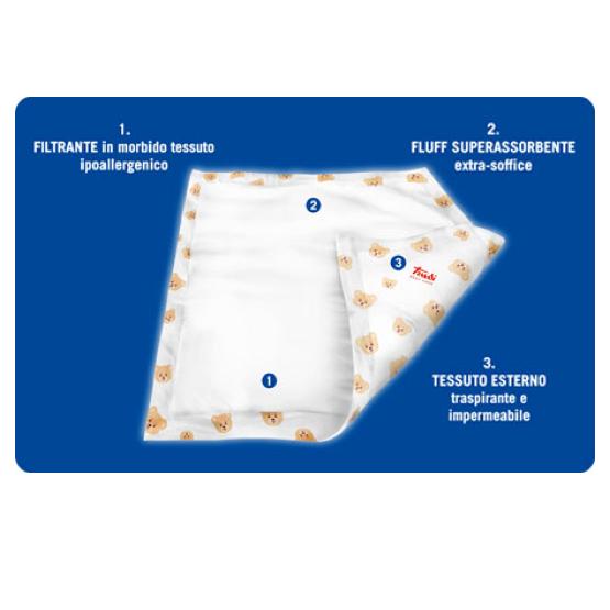 - Filtrante ipoallergenico ed atossico nella parte a contatto con il bimbo; - morbido materassino di cellulosa per assorbire eventuali liquidi e interporre un morbido cuscinetto tra il bimbo e la superficie d’appoggio;